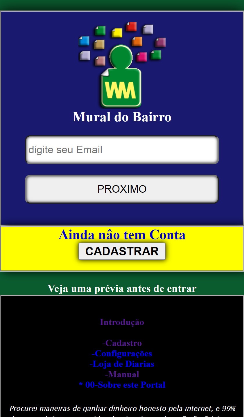 Apenas com Email e senha, é liberado o Mural de Cidades e Bairros.