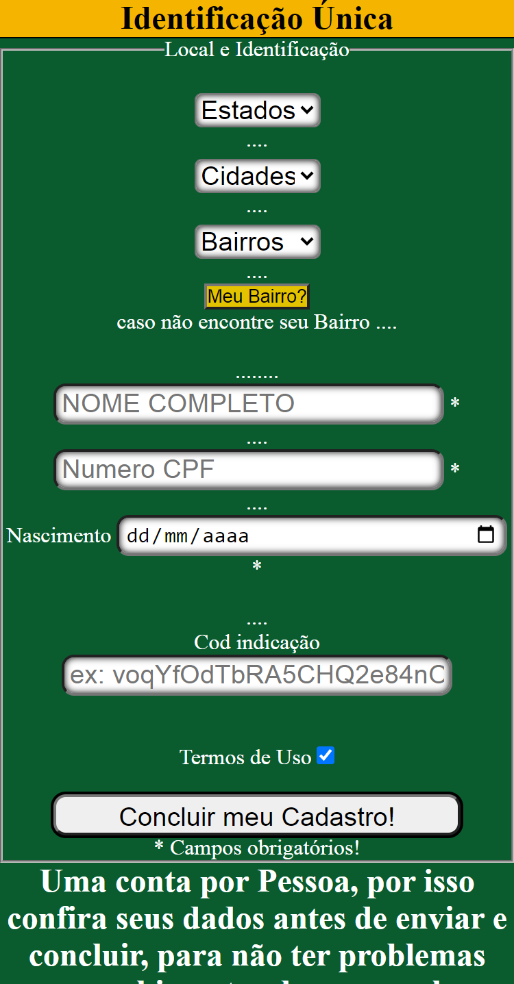 Usuarios confirmados como pessoas autenticas, ou seja, por documento de CPF, por motivo de cada usuario tenha apenas uma conta neste Portal. Mesmo antes da Confirmação do documeto, o usuario cadastrado recebe (50 Fichas BONUS) gratuitamente para colar notas em outro mural, ou vender se desejar. Se o Usuario usar o codigo de indicação recebe mais 50 Fichas Bonus, e que indicou tambem recebe mais 50 Fichas.
